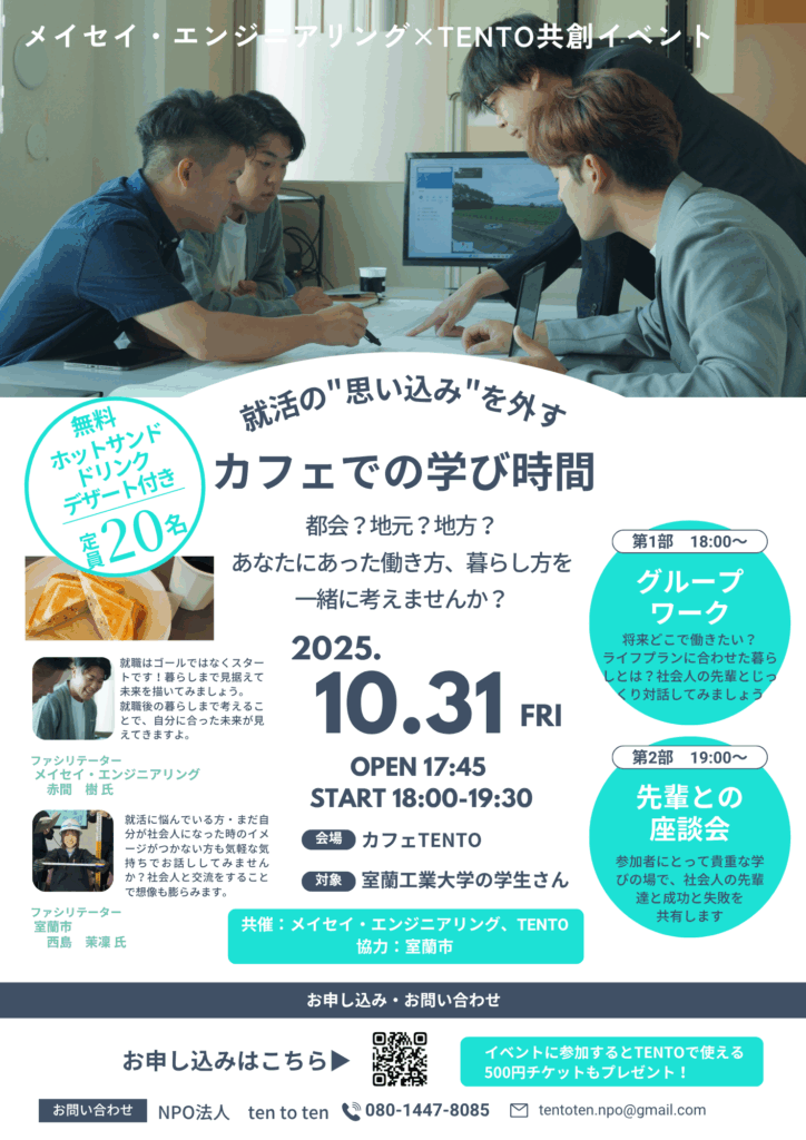 2025年10月31日(金曜日)、弊社と室蘭工業大学カフェTENTOとの共創イベント「就活の”思い込み”を外す カフェでの学び時間」を開催します。