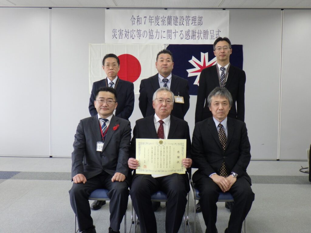 令和8年2月25日、むろらん広域センタービルにて執り行われた「令和7年度 胆振総合振興局室蘭建設管理部 感謝状贈呈式」において、北海道胆振総合振興局より感謝状をいただきました。