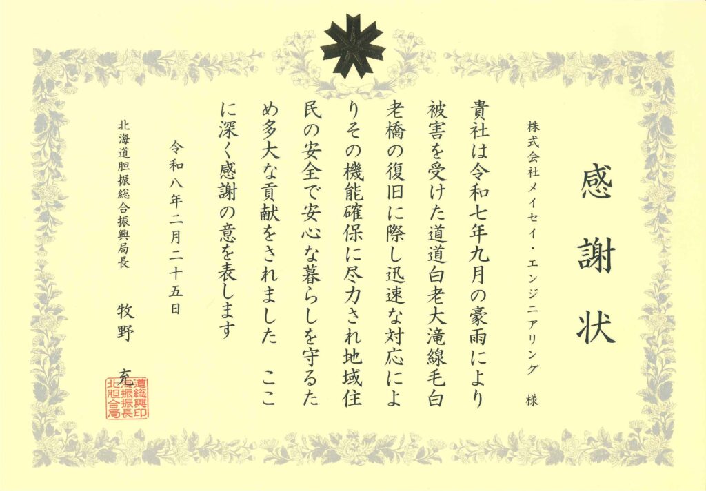 今回の感謝状は、令和7年9月の記録的な豪雨により被害を受けた「道道白老大滝線 毛白老橋」の復旧に貢献したことを評価いただいたものです。